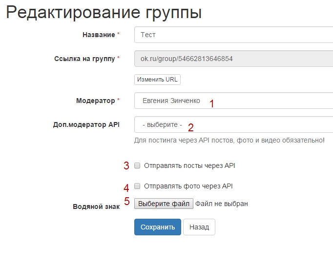 Далее представлен скриншот с настройками группы, важные поля помечены цифрами.