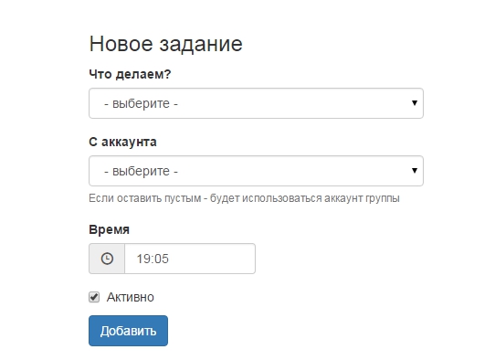 Во втором мы можем выбрать аккаунт, с которого данное действие произойдет. Помните, мы с вами при добавлении группы выбирали основного модератора? Дак вот, этот пункт имеет приоритет над настройками у группы. И при создании расписания можно добиться того, что каждое действие будет выполнено с разного аккаунта.