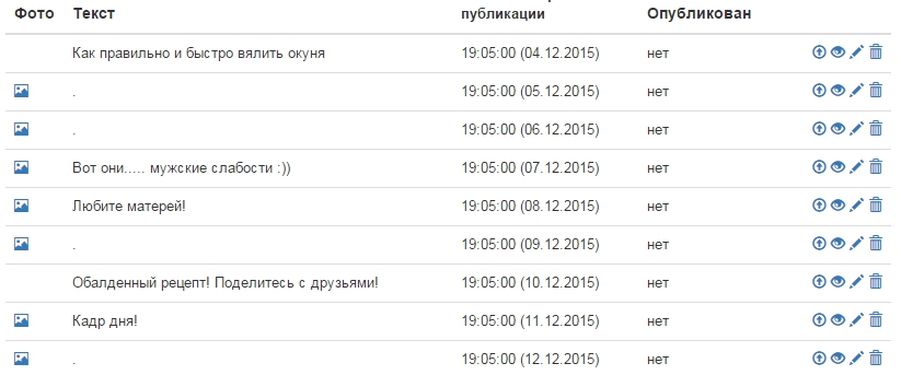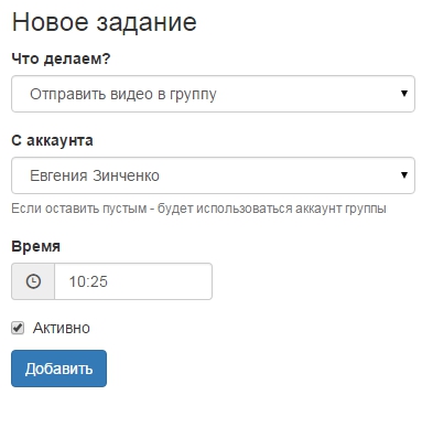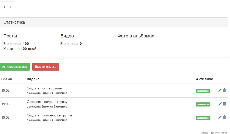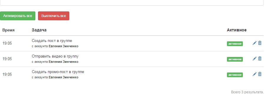 Аккаунт, с которого будет выполняться данное действие. Время. Активной эта позиция является или нет. Тут же можно изменить каждую позицию или просто удалить.
