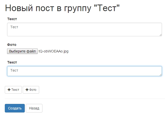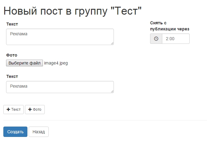 Как видите, в нашем сервисе можно постить и многосекционные посты, состоящие из нескольких элементов, в данном случае представлен пост вида: Текст-Фото-Текст (бутерброд).