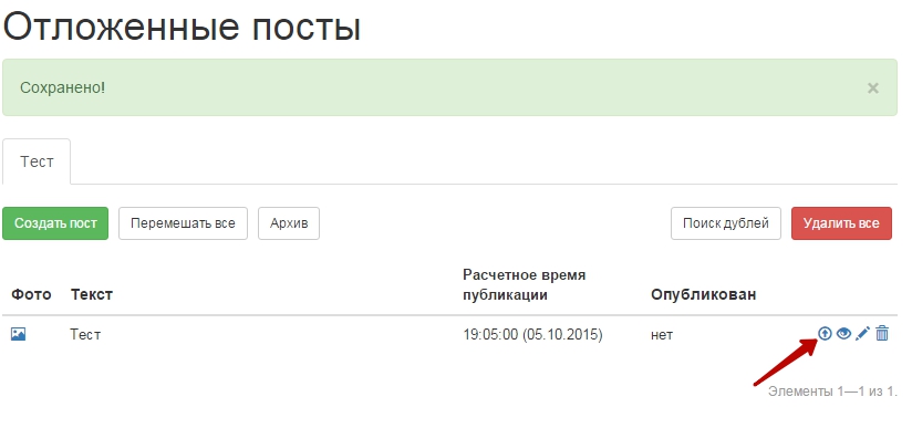 Здесь вы можете удалить, просмотреть, отредактировать ваши посты. Есть еще кнопка “Перемешать все”, которая перемешивает все посты в случайном порядке. Так же вы можете отправить пост сразу в группу, минуя расписание, что сейчас мы с вами и сделаем, для того чтобы протестировать работу сервиса. Эта кнопочка показана красной стрелочкой.