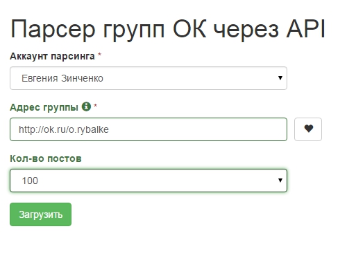 URL группы, выбрать количество постов и нажать на кнопку “Загрузить”: