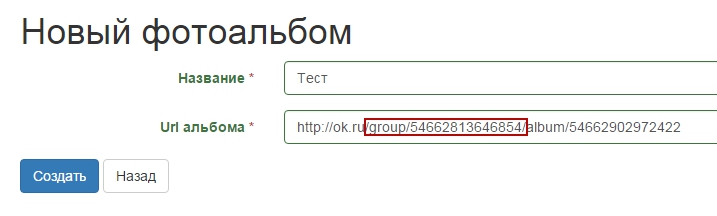 Здесь мы с вами вводим название альбома и его полный URL, только необходимо учесть, что если вы добавили группу по длинному адресу, тогда и альюом необходимо добавлять через длинный адрес, как на рисунке выше. А если группа добавлена через короткий адрес, тогда вместо выделенного на рисунке адреса группы, должно быть короткий адрес группы. Иначе могут возникать ошибки.