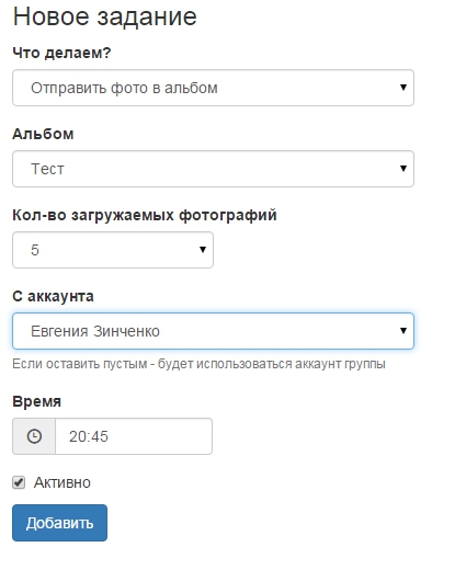 Здесь появляются дополнительные поля: выбор альбома, так как их может быть несколько, кол-во загружаемых фото за один раз и так же можно выбрать аккаунт и время отправки в группу.