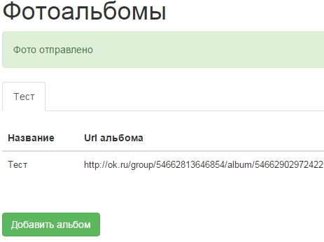 Теперь зайдем опять в “Фотоальбомы” и отправим его в группу, если все верно, то увидим сообщение об успешной отправке: