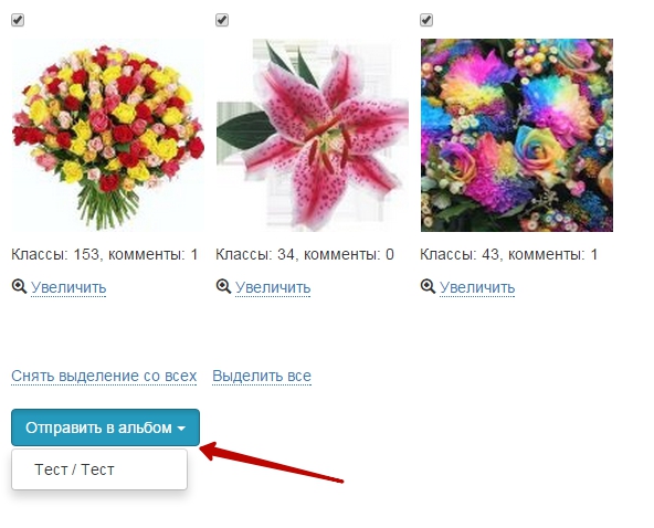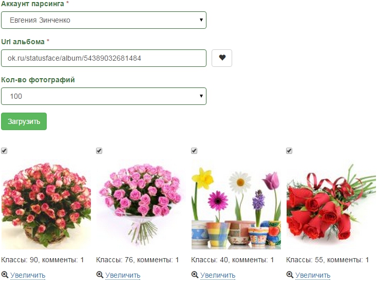 В этом парсере мы так же можем снять галочки с тех фото, которые нам не нужны, посмотреть увеличенное изображение и подпись, а после этого отправить в альбом: