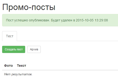 Наш сервис так же публиковать и промо-посты. Они практически не отличаются от обычных постов, отличие только в том, что добавлено дополнительный параметр - через сколько времени его удалить из группы: