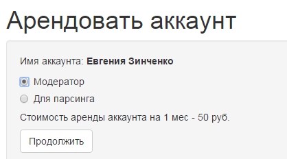 Вам будет показано имя арендуемого аккаунта. Выбираем модератора. ВНИМАНИЕ! Аренда аккаунта не бесплатная. После этого жмем кнопку “продолжить”.